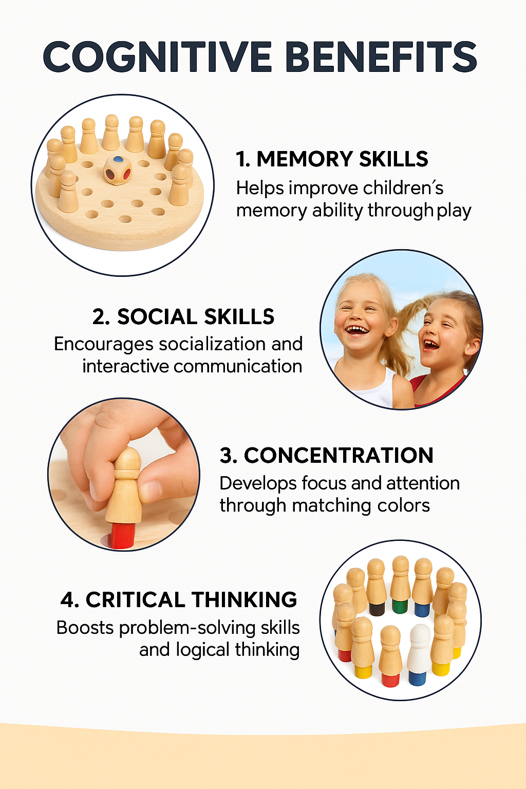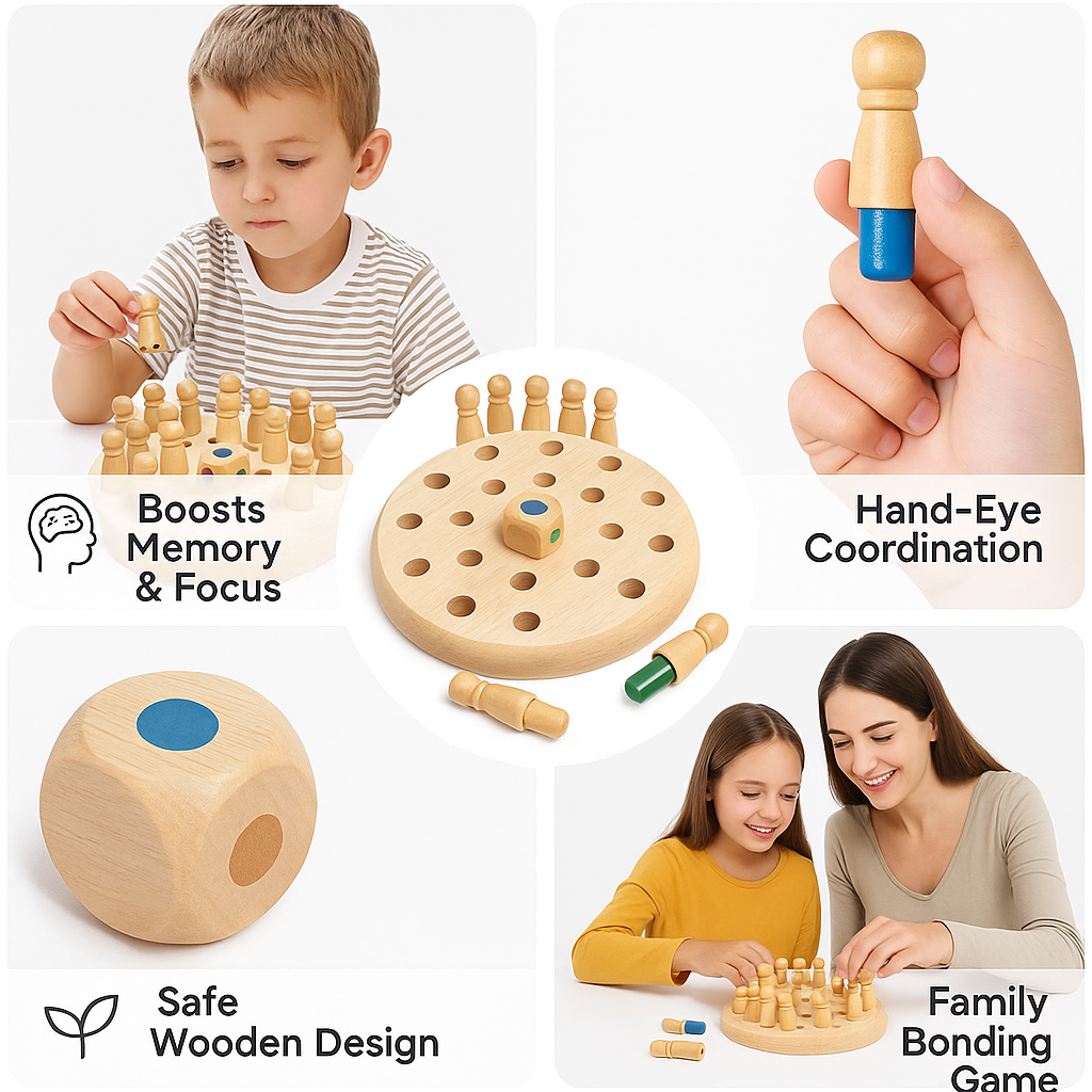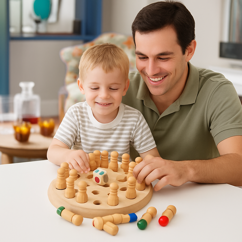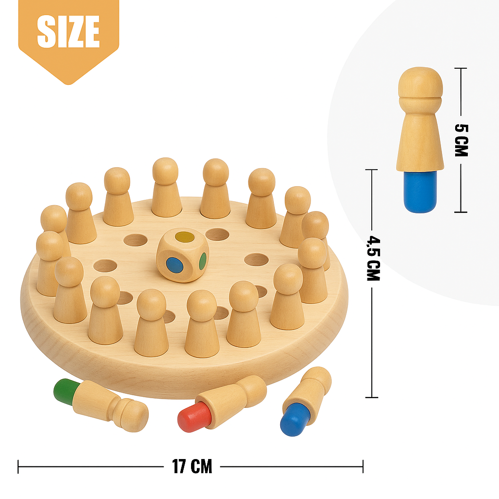 Meta description: Classic wooden memory board game with 24 color pegs & dice. Builds memory, focus and hand–eye coordination for ages 3–7.