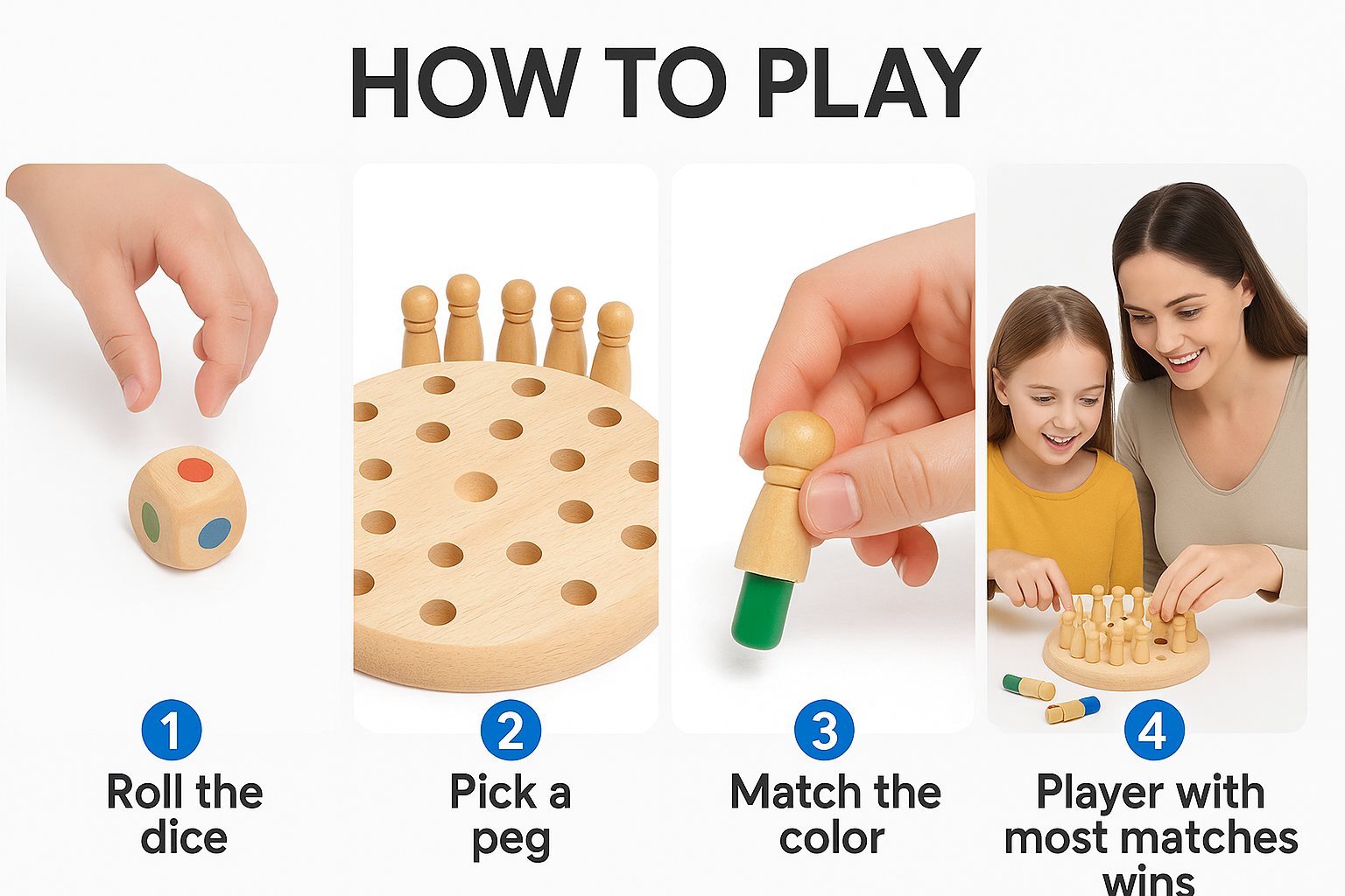 A classic wooden memory & matching game for kids and families. Roll the color dice, pick a hidden peg and check the color—if it matches, you keep the peg and play again! This simple activity trains memory, concentration and logical thinking while promoting gentle, screen-free play.
